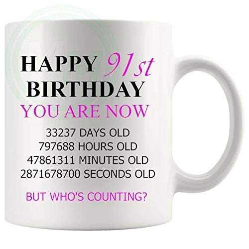 91st Birthday Novelty Gift Mug Pink Lettering is the perfect funny gift for a 91st Birthday. Ideal when you want to give her something a little different.