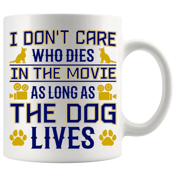 Our novelty mug design, I Dont Care Who Dies In The Movie, is the ideal gift for any dog lover! The perfect present for every fur mom or fur dad! Give them a present that they will use every day. The full text reads “I DON’T CARE WHO DIES IN THE MOVIE AS LONG AS THE DOG LIVES” We have thousands of designs to choose from, funny, loving or, if you’re brave enough, laughing at the recipient! If you don’t see the design you want, feel free to use our “contact us” form and we will try our best to assist with your request.